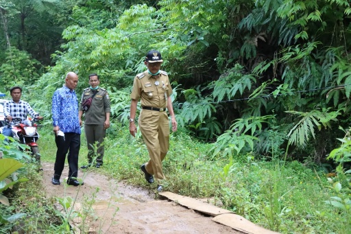 KIPRAH.CO.ID– Bupati Pesisir Barat, Agus Istiqlal mengunjungi jembatan roboh yang menghubungkan Melesom-Lombok, Pekon Pagar Dalam, Kecamatan Lemong, Senin (17/5/2021).