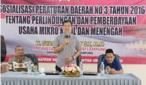 KIPRAH.CO.ID– Anggota DPRD Provinsi Lampung, Syarif Hidayat menggelar sosialisasi peraturan daerah nomor 3 tahun 2016 tentang perlindungan dan pemberdayaan usaha mikro kecil dan menengah.
