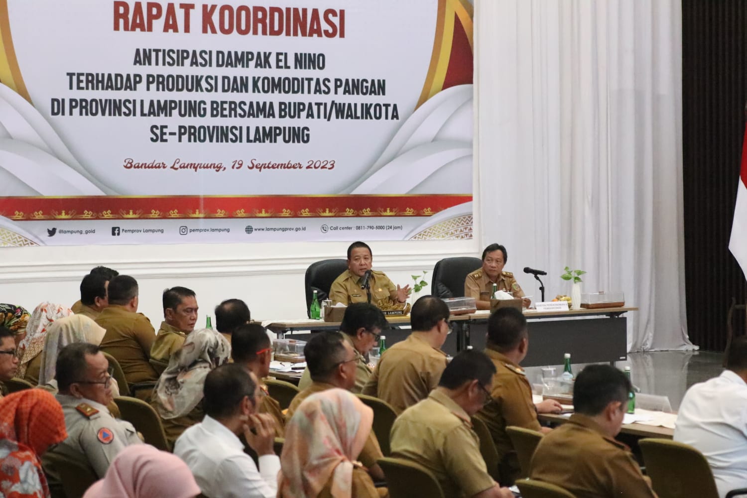 Gubernur Lampung Arinal Djunaidi menggelar Rapat Koordinasi antisipasi dampak El Nino terhadap produksi dan komoditas pangan di Provinsi Lampung bersama Bupati/Walikota Se-Provinsi Lampung, di Mahan Agung, Selasa (19/09/2023).