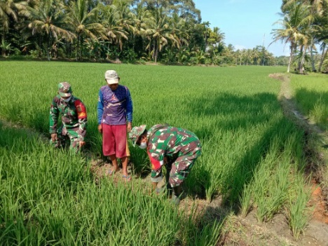 Untuk membantu mewujudkan harapan petani akan hasil panen yang melimpah, Babinsa Koramil 422-02/Pesisir Selatan Kodim 0422/Lampung Barat Sertu Maryono terjun langsung dalam perawatan tanaman padi Milik Warga di Pekon Biha Kabupaten Pesisir Barat, Kamis (27/1/2022).