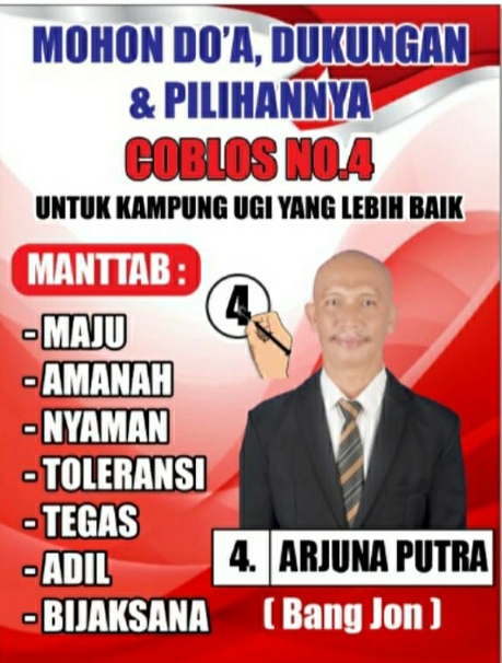 Pria tegap dan berkepala plontos ini biasa dipanggil Bang Jon. Ia mendapat nomor urut 04. Memiliki visi bersatu dengan masyarakat membangun Desa Ujung Gunung Ilir dengan jujur, adil dan berkesinambungan, serta dengan semangat gotong royong melalui musyawarah mupakat.