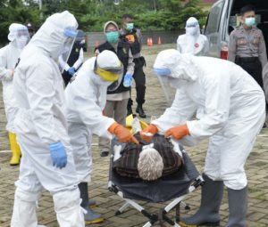 “Ya, kita simulasi mulai dari penanganan jenazah Covid-19 dirumahnya atau dimana ia ditemukan telah meninggal dunia. Lalu, petugas melakukan olah TKP dan mengidentifikasi setelah sebelumnya dilakukan penyemprotan disinfektan kepada jenazah dan dilingkungannya,” kata dia.