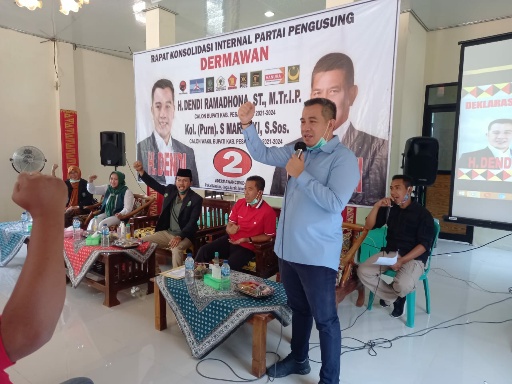 Hal ini Dendi sampaikan dalam kegiatan Rapat Konsolidasi Rapat Internal Partai Pengusung Dendi Ramadhona dan Marzuki untuk Pesawaran atau biasa disingkat Dermawan di Desa Sanggi, Padang Cermin, Pesawaran.(Tim)