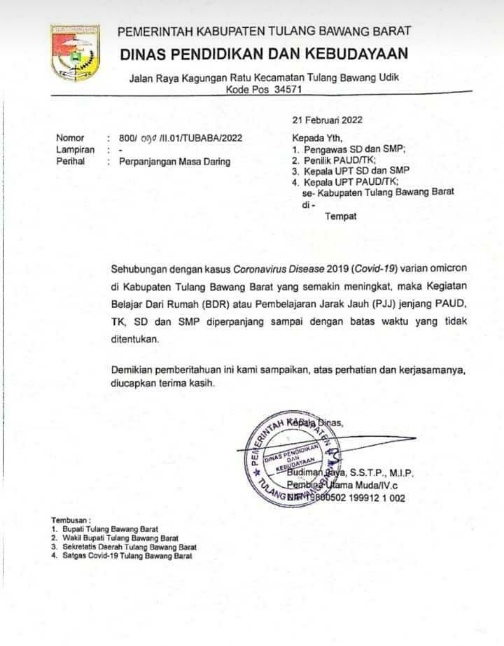 “Sehubungan dengan kasus Corona Virus Disease 19 (Covid-19) varian Omicrcon di Kabupaten Tulangbawang Barat yang semakin meningkat, maka kegiatan belajar dari rumah atau belajar jarak jauh (BJJ) jenjang PUD, TK, SD dan SMP diperpanjang sampai dengan batas waktu yang tidak ditentukan,” ujarnya, Senin (21/2/2022).