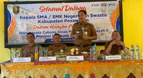 KIPRAH.CO.ID– Kepala Dinas Pendidikan dan Kebudayaan Provinsi Lampung, Thomas Amirico, S.STP., S.H., melaksanakan kegiatan pembinaan bagi seluruh kepala sekolah jenjang SMA/SMK Negeri dan Swasta se-Kabupaten Pesawaran. Kegiatan berlangsung di SMAN 1 Padang Cermin, Kabupaten Pesawaran, pada Selasa, 26 Agustus 2025.