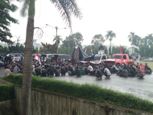 KIPRAH.CO.ID– Selain diguyur hujan, aksi massa yang berlangsung di lingkungan Kantor Gubernur Lampung, Senin (10/2/2020), juga diwarnai dengan doa bersama, kemudian disusul gema teriakan takbir yang seolah menyiratkan bahwa tak ada kompromi pada gubernur selain harus mencabut segera izin operasional pasir hitam perusahaan PT Lautan Indonesia Persada (LIP) di Gunung Anak Krakatau (GAK).