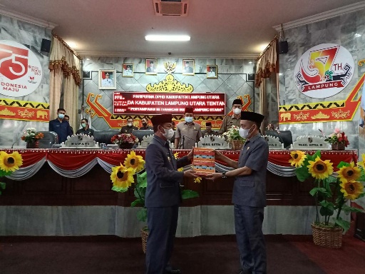 Bupati Lampung Utara juga menyampaikan RPJMD perubahan tahun 2019-2024, memuat sasaran strategi perencanaan pembangunan daerah untuk mewujudkan masyarakat yang aman dan agamis. (Yudi)
