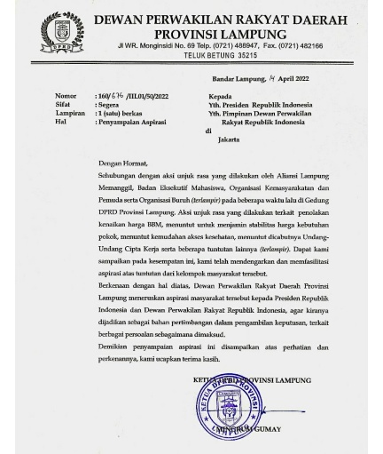 KIPRAH.CO.ID– DPRD Provinsi Lampung menghantarkan aspirasi masyarakat Lampung ke pemerintah pusat. Hal ini merupakan tindak lanjut dari aksi unjuk rasa dari Aliansi Lampung Memanggil, Rabu (13/04/2022) lalu.
