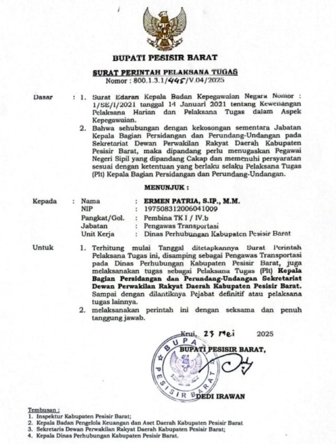 Surat perintah pelaksana tugas tersebut di tanda tangani di Krui oleh Bupati Pesibar, Dedi Irawan.