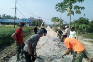 Danramil 02/Tanah merah Kapten Inf Handoko selaku pengawas di penimbunan jalan dengaan sertu semangat masyarakat sangat mengacungkan jempol kepada masyarakat yang ada di Desa sanglar tersebut.