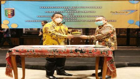 KIPRAH.CO.ID– Membidik pengembangan potensi ikan tuna dan perikanan darat, Pemprov Lampung menjalin kerjasama dengan Perum Perindo. Kerjasama langsung dilakukan penandatanganan nota kesepahaman (MoU) antara Pemerintah Provinsi Lampung yang langsung ditandatangani Gubernur Lampung Ir. Arinal Djunaidi dan Direktur Utama Perusahaan Umum Perikanan Indonesia (Perum Perindo)