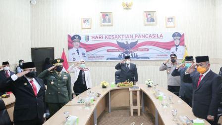 KIPRAH.CO.ID— Gubernur Arinal Djunaidi dan Wakil Gubernur Chusnunia Chalim, serta Forkopimda Provinsi Lampung, mengikuti Upacara Peringatan Hari Kesaktian Pancasila yang dipimpin langsung oleh Presiden Joko Widodo (Jokowi) melalui virtual dari Ruang Command Center, Dinas Kominfo Provinsi Lampung, Kamis (1/10/2020).