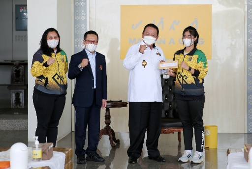 KIPRAH.CO.ID– Gubernur Lampung, Arinal Djunaidi memberikan bonus secara simbolis kepada atlet dan pelatih Pekan Olahraga Nasional (PON) peraih medali emas, perak, dan perunggu di Mahan Agung, Bandar Lampung, Rabu (20/4/2022).