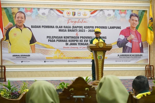 KIPRAH.CO.ID– Gubernur Lampung diwakili Sekretaris Daerah Provinsi Lampung Fahrizal Darminto mengukuhkan Pengurus Badan Pembina Olah raga (BAPOR) KORPRI Provinsi Lampung masa Bakti 2023-2028 sekaligus Pelepasan Kontingen Provinsi Lampung Pada Pekan Olah raga Nasional (PORNAS) KORPRI XVI 2023 Jawa Tengah, di Balai Keratun Lt.3 komplek Kantor Gubernur, Jum’at (07/07/2023).