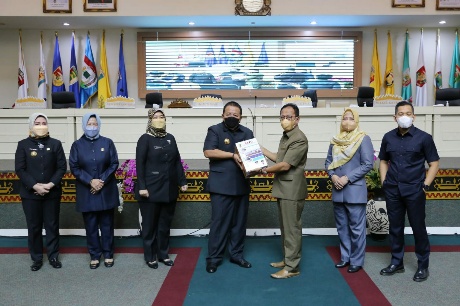 KIPRAH.CO.ID– Gubernur Lampung Arinal Djunaidi menyerahkan dokumen Laporan Keterangan Pertanggung Jawaban (LKPJ) Kepala Daerah Provinsi Lampung Tahun Anggaran 2021 kepada Ketua DPRD Provinsi Lampung Mingrum Gumay dalam Rapat Paripurna DPRD Provinsi Lampung, di Ruang Sidang DPRD Provinsi Lampung, Bandar Lampung, Senin (18/4/2021).