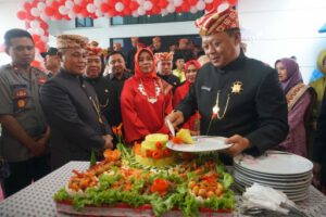 Nampak terlihat Pelaksana tugas (Plt) Bupati Lampung H. Nanang Ermanto didampingi Ketua TP PKK Hj. Winarni serta anggota DPRD Lampung Selatan dan segenap undangan yang hadir bersuka cita menyaksikan pemotongan nasi tumpeng oleh Ketua DPRD Lampung Selatan H. Hendry Rosyadi yang berlangsung di luar gedung DPRD setempat.