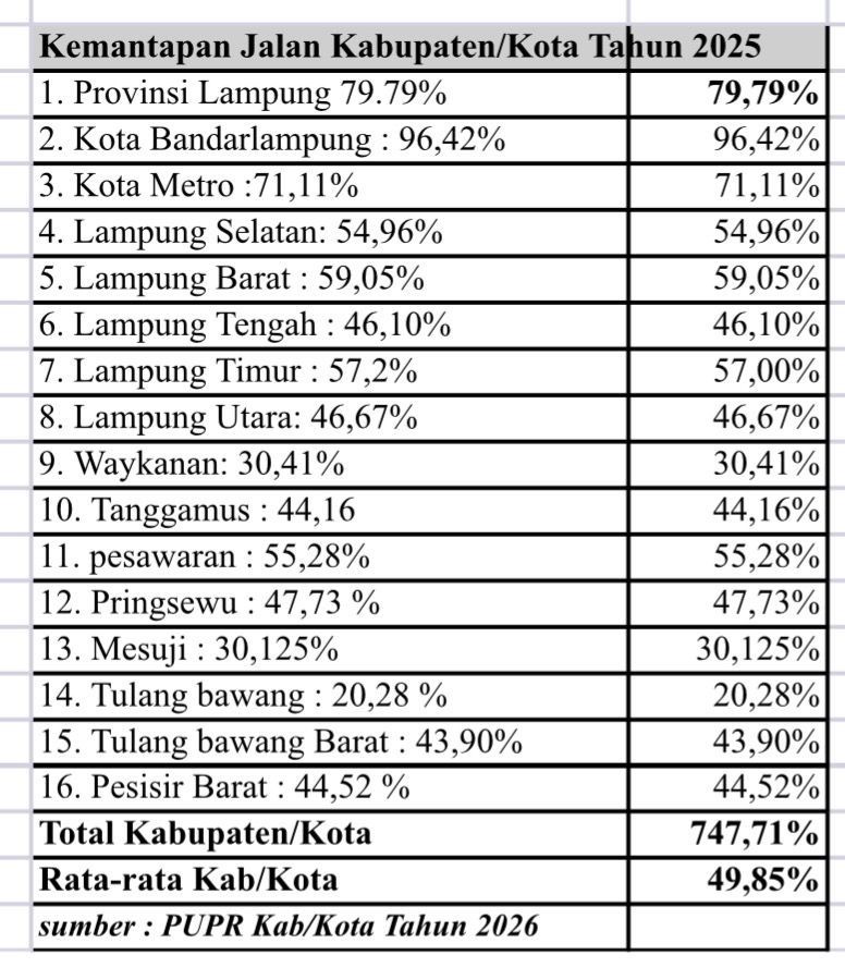 KIPRAH.CO.ID, LAMPUNG—- Lampung sedang berdiri di persimpangan yang ganjil, di atas jalan provinsi yang relatif mulus, tetapi dengan fondasi kabupaten yang retak di banyak tempat. Data kemantapan jalan kabupaten/kota tahun 2025 membuka kenyataan yang tak lagi bisa disangkal, ketimpangan infrastruktur bukan sekadar ada, melainkan telah melebar menjadi jurang.