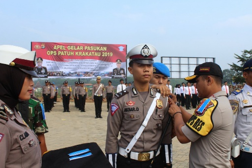 Dalam pelaksanaan gelar apel pasukan, Kapolres juga menyematkan pita kepada perwakilan personil TNI, Satlantas, Dishub dan Sat Pol PP guna menandakan dimulainya Operasi Patuh Krakatau 2019.