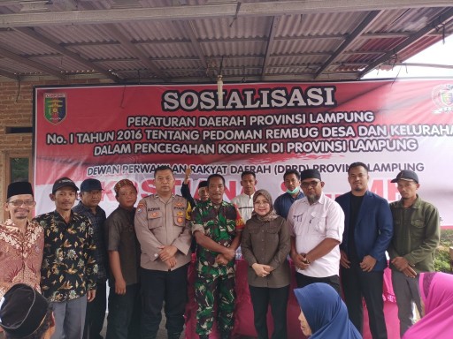 Seperti yang dilakukan oleh Kostiana, SE.,MH yang merupakan salah satu anggota DPRD Provinsi Lampung dapil Kota Bandarlampung yang melangsungkan sosialisasi peraturan daerah nomor 1 tahun 2016 tentang pedoman rembug desa dan kelurahan dalam pencegahan konflik di provinsi Lampung.