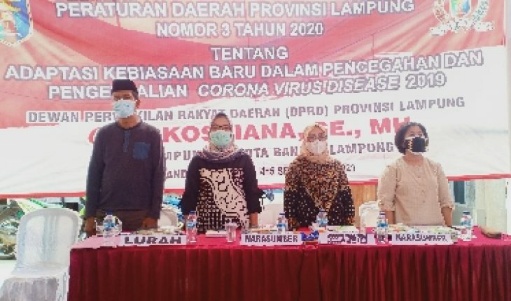 Kostiana anggota DPRD provinsi Lampung dapil 1 Kota Bandarlampung menggelar sosialisasi peraturan daerah provinsi Lampung nomor 3 tahun 2020 tentang adaptasi kebiasaan baru dalam pencegahan dan pengendalian corona virus disease 2019.