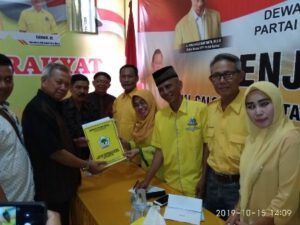 Usai pengembalian berkas Balonkada di DPD NasDem, Lukman Hakim, bertolak ke kantor DPD II Golkar untuk mengambil berkas pendaftaran Fritz Ahmad Nuzir, disambut Ketua Tim Penjaringan. (Nia)