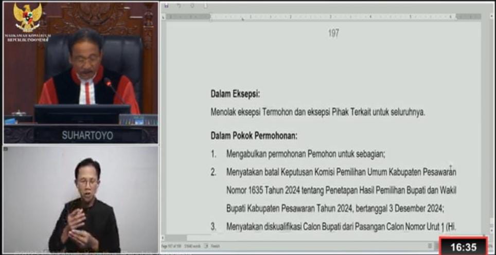 Hal ini disampaikan saat putusan Sidang perkara PHPU dengan Perkara Nomor 20/PHPU.BUP-XXIII/2025, oleh hakim Ridwan Mansyur.