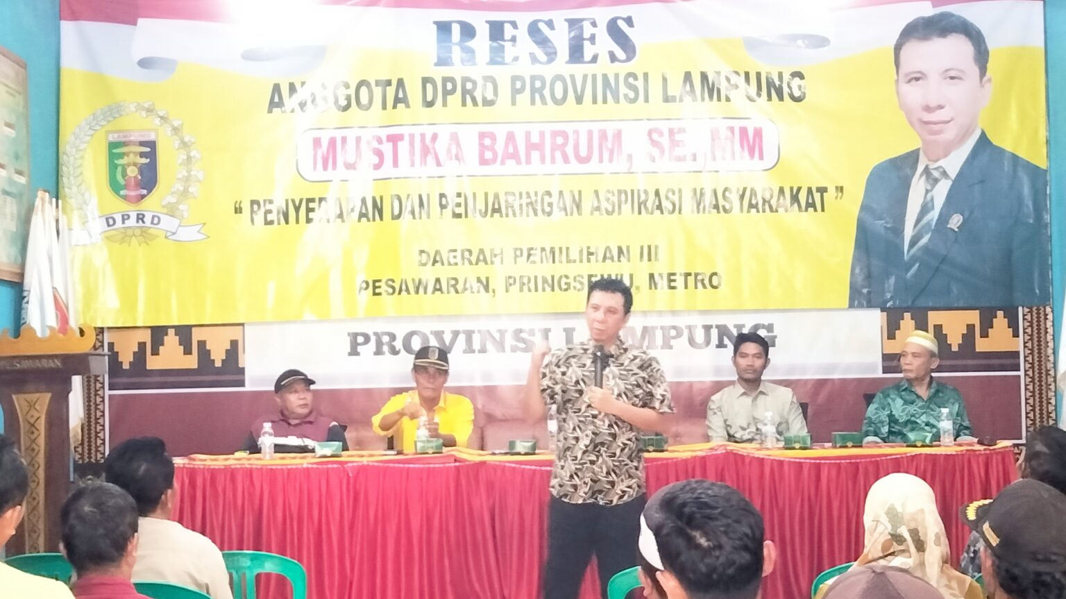 Sementara, dalam sambutanya Mustika Bahrum menyampaikan bahwa kegiatan reses ini merupakan kegiatan rutin tiga bulanan wakil rakyat DPRD Provinsi Lampung untuk menyerap aspirasi masyarakat sebagai kado untuk di perjuangkan melalui lembaga legislatif.