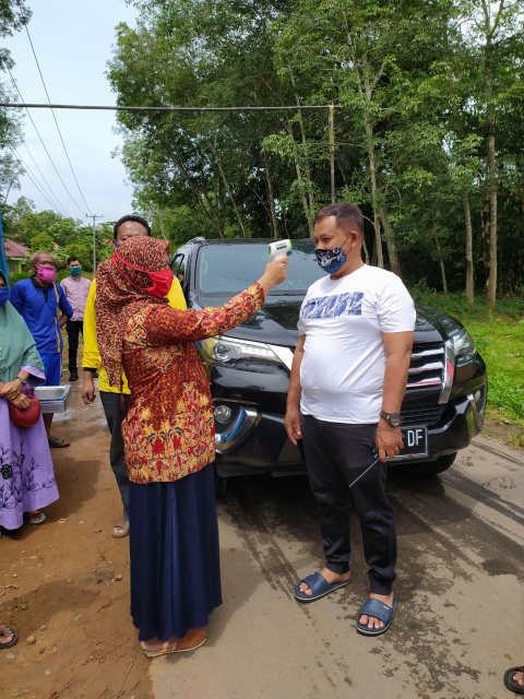 “Maaf pak, kita lakukan pemeriksaan dulu,” ujar petugas sambil menyodorkan Thermogun untuk mengecek suhu Plt. Bupati, Nanang Ermanto beserta istri.
