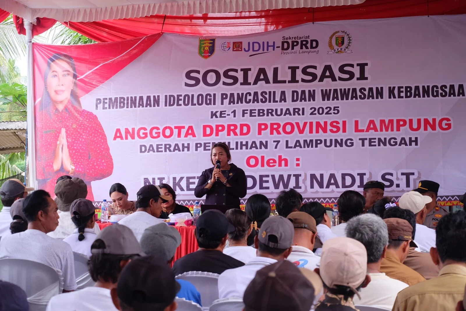 Dalam upaya memperkuat ideologi Pancasila dan memperkenalkan wawasan kebangsaan kepada masyarakat, Anggota DPRD Provinsi Lampung, Ni Ketut Dewi Nadi, menggelar sosialisasi pembinaan ideologi Pancasila dan Wawasan Kebangsaan dengan tema “Jaga Tradisi Pertanian yang Berlandaskan Pancasila” di Kampung Rama Dewa, Dusun 4, Kecamatan Seputih Raman, Kabupaten Lampung Tengah, Selasa (11/2).