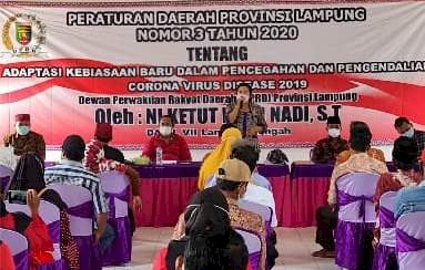 KIPRAH.CO.ID– Anggota DPRD Provinsi Lampung Dapil Lampung Tengah Ni Ketut Dewi Nadi, kembali melakukan Sosialisasi Peraturan Daerah Nomor 3 tahun 2020 tentang adaptasi kebiasaan baru dalam Pencegahan dan Pengendalian Covid-19. Sosialisasi berlangsung di Kampung Rawa Betik, Kecamatan Seputihsurabaya, Sabtu (3/4/2021).