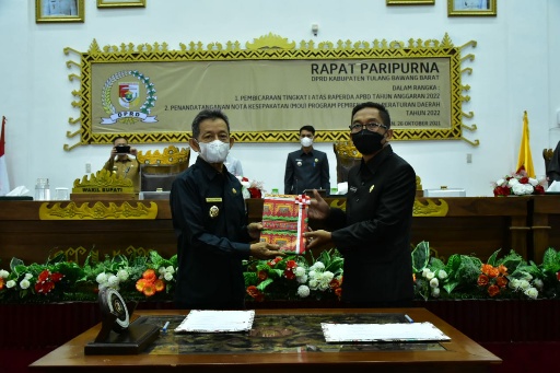 KIPRAH.CO.ID– Rapat Paripurna Pembicaraan Tingkat I atas Raperda APBD Tahun Anggaran 2022 dan Penandatanganan Nota Kesepakata (MoU) Program Pembentukan Perda Tahun 2022 di Ruang Paripurna DPRD Tulangbawang Barat, Selasa (26/10/2021).