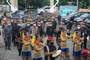 Gubernur Lampung, Arinal Djunaidi yang hadir mengenakan pakaian adat Lampung, tiba di halaman Gedung DPRD Lampung Selatan sekitar pukul 09.10 WIB disambut dengan Tarian Khudat dan Piccak Khakot.