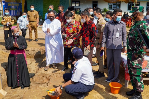 KIPRAH.CO.ID– Bupati Tulangbawang Barat, Umar Ahmad, S.P menghadiri acara peletakan batu pertama Gereja Hati Kudus Stasi Margo Mulyo di Tiyuh Margo Mulyo, RT. 003 RW.001, Kecamatan Tumijajar, Senin (7/6/2021).