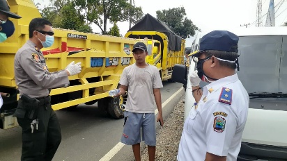 Selain melakukan penyemprotan disinfektan, Tim Covid 19 Kabupaten Lampung Selatan juga membagikan masker gratis dan air mineral kepada pengemudi dan penumpang yang melintas.