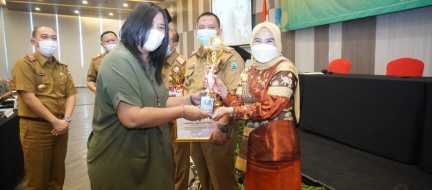 Penghargaan diserahkan oleh Perwakilan Kementerian Dalam Negeri, Dewi Sulamdari kepada Ketua Tim Penggerak PKK Kabupaten Lampung Selatan, Hj. Winarni Nanang Ermanto selaku Duta Swasembada Gizi dalam acara Pertemuan Aksi Konvergensi Stunting Provinsi Lampung di Hotel Novotel Bandar Lampung, Selasa (25/5/2021).