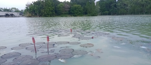 “Sayang sekali banyak ikan-ikan yang mati bahkan ada yang sudah busuk di kolam ini, Mas. Kalo ini tidak segera dibersihkan bisa-bisa nanti lebih banyak lagi yang mati”, ungkap Lia bersama keluarga kecilnya.
