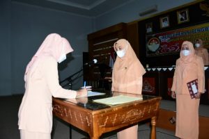 KIPRAH.CO.ID– Pengukuhan pengurus Dharma Wanita Persatuan, Unsur Pelaksana Badan/Dinas/Kantor dan Kecamatan Kabupaten Tulang Bawang Barat masa bhakti 2021-2024 oleh Ketua Dharma Wanita Persatuan Kabupaten Tulang Bawang Barat Ny. Novianti Novriwan di Aula Sekretariat Pemkab, Kamis (8/4/2021).