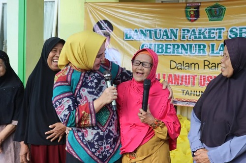 KIPRAH.CO.ID– Ketua Lembaga Koordinasi Kesejahteraan Sosial (LKKS) Provinsi Lampung Riana Sari Arinal menyerahkan bantuan Paket Sembako dalam rangka Hari Lanjut Usia Nasional ke-29 di Pekon Pringsewu Timur, Senin (19/06/2023).