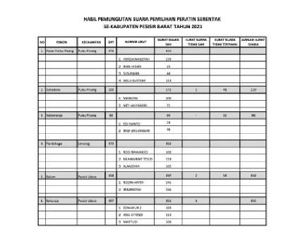 Hasil resminya, akan diumumkan setelah Dinas Pemberdayaan Masyarakat dan Pekon (PMP) menerima berkas Laporan Hasil Pelaksanaan Pilratin dari Camat Lemong, Pulau Pisang dan Camat Pesisir Utara, tulis Edwin Kastolani Burtha, Pelaksana tugas (Plt) Dinas PMP Pesisir Barat melalui pesan singkatnya. (Gus)