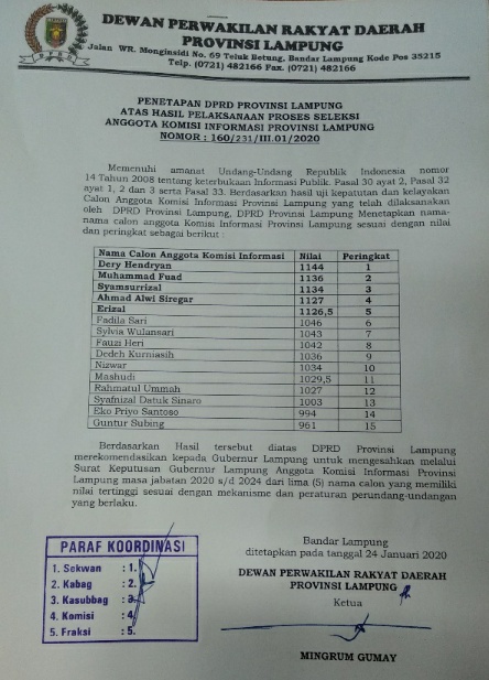 KIPRAH.CO.ID– Pimpinan DPRD Provinsi Lampung resmi mengumumkan hasil pelaksanaan proses seleksi anggota Komisi Informasi (KI) Provinsi Lampung nomor 160/231/III.01/2020.