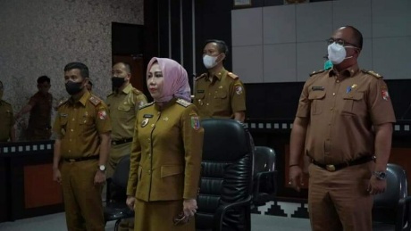 KIPRAH.CO.ID– Penjabat (Pj) Bupati Tulangbawang Barat (Tubaba) Zaidirina, mendengarkan arahan Presiden Republik Indonesia (RI) Ir. Joko Widodo tentang Evaluasi Percepatan Peningkatan Penggunaan Produk Dalam Negeri (P3DN) pada pengadaan barang/jasa secara virtual melalui video conference (Vidcon), Selasa (24/5/2022).