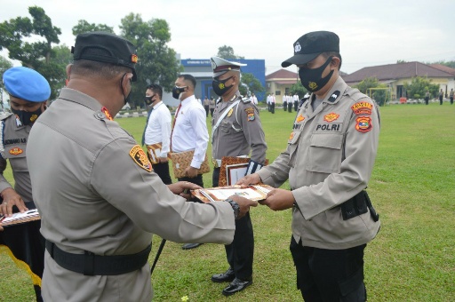 “Hari ini kami menggelar upacara pemberian reward kepada 29 personel Polres dan Polsek jajaran yang telah berprestasi di dalam melaksanakan tugas-tugas kepolisian,” ujar AKBP Hujra.