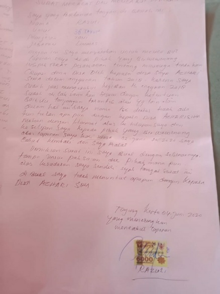 Saat dimintai klarifikasi Kepala Desa Tanjung Kerta, Azhari Siha, menampik tudingan tersebut dan mengklaim telah merealisasikannya.