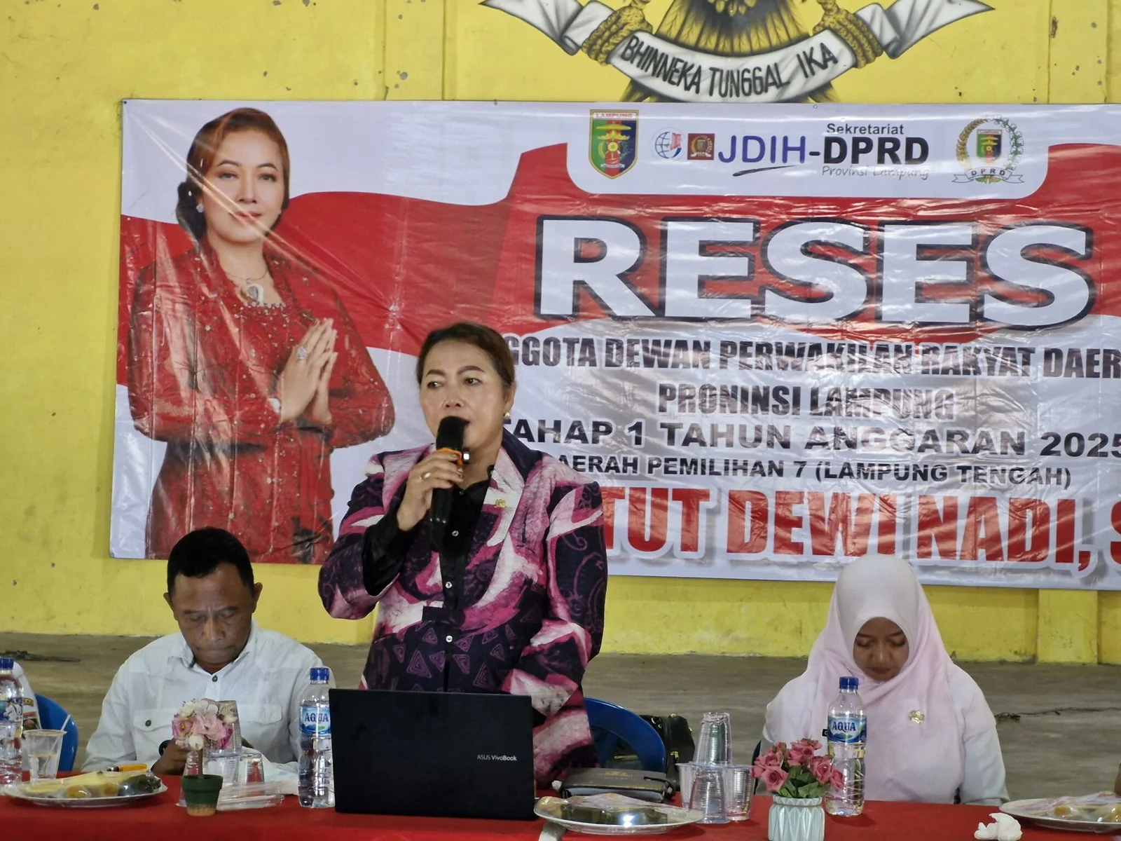 Anggota DPRD Provinsi Lampung, Ni Ketut Dewi Nadi, melaksanakan kegiatan reses di Balai Kampung Karang Endah, Kecamatan Terbanggi Besar, Kabupaten Lampung Tengah, pada Rabu, 26 Februari 2025. Dalam kegiatan tersebut, Ni Ketut Dewi Nadi menyerap berbagai aspirasi dan keluhan dari masyarakat setempat, yang mayoritas berkaitan dengan kondisi infrastruktur yang memprihatinkan di beberapa wilayah.