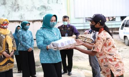 Bantuan diberikan langsung oleh Riana Sari pada Program Jum’at Barokah ke-8, di Halaman Kantor PKK Provinsi Lampung Telukbetung Bandarlampung, Jum’at (5/6/2020).