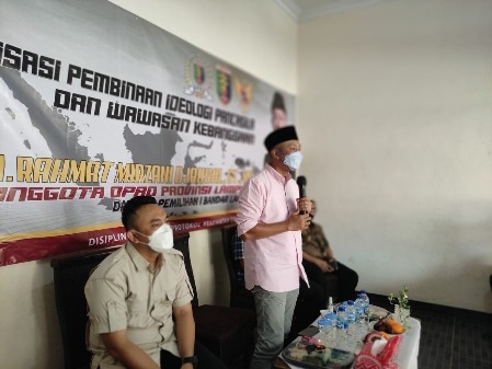 KIPRAH.CO.ID– Rahmat Mirzani Djausal, anggota DPRD provinsi Lampung menggelar sosialisasi pembinaan ideologi pancasila dan wawasan kebangsaan untuk meningkatkan wawasan kebangsaan dan pengetahuan tentang nilai-nilai Pancasila di tengah masyarakat, khususnya para pemuda di tengah kemajuan teknologi dan perkembangan zaman di Kelurahan Rajabasa Pramuka, Kecamatan Rajabasa, Bandarlampung, Jumat (19/3/2021).
