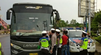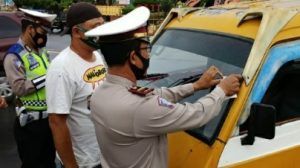 Polri serentak melaksanakan kegiatan, berupa himbauan disiplin 3 M, diantaranya melalui penempelan sticker bertulis Stop Covid-19 pada kendaraan angkutan umum yang melintas.