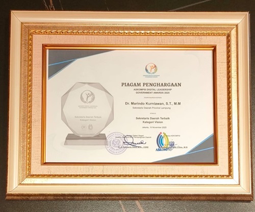 KIPRAH.CO.ID– Sekretaris Daerah Provinsi Lampung Dr. Marindo Kurniawan, ST, MM mendapatkan predikat sebagai Sekda Terbaik di Seluruh Indonesia. Predikat tersebut disandang dalam agenda Asosiasi Dinas Kominfo Provinsi Seluruh Indonesia (ASKOMPSI) Digital Leadership Goverment Award 2025 di Hotel Mercure, Surabaya, 20 November 2025.
