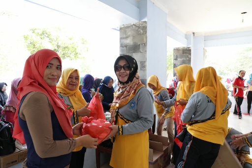 KIPRAH.CO.ID– Ketua Tim Penggerak PKK Hj Septi Istiqlal senam bersama dengan masyarakat Pesisir Tengah dan menyerahkan sembako murah secara simbolis di depan Gedung Serba Guna (GSG) Selalaw, Labuhan Jukung, Minggu (15/9/2019).