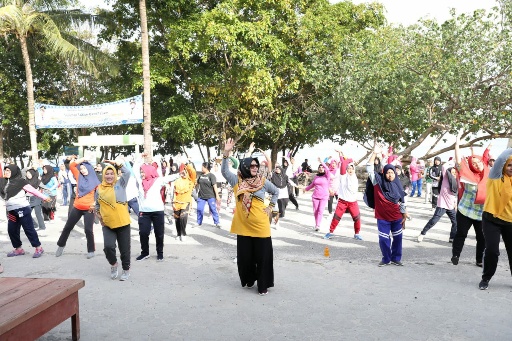 KIPRAH.CO.ID– Ketua Tim Penggerak PKK Hj Septi Istiqlal senam bersama dengan masyarakat Pesisir Tengah dan menyerahkan sembako murah secara simbolis di depan Gedung Serba Guna (GSG) Selalaw, Labuhan Jukung, Minggu (15/9/2019).